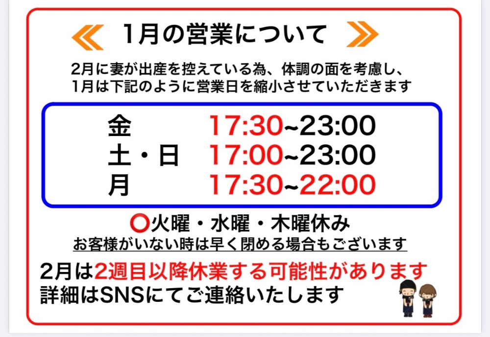 2月に妻が出産を控えております為、1月より営業日を縮小させていただきます。ご不便をおかけしますが、よろしくお願いします🙇🏻♂️🙇🏻♀️2026.1.12